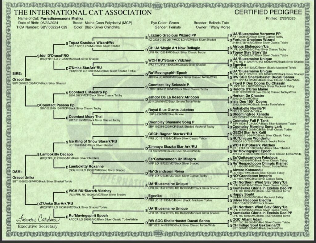 Maine Coon Queen – MishkaPuraVidaCoonsJuly 6, 2025Maine Coon Breeding Females Color: Shaded TorieBorn: June 22nd, 2024Weight: 16lbs